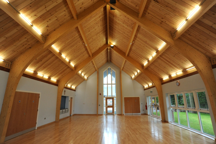 Construction of new school hall. Comprising of main play area, kitchen, toilets and stores, with glulam trusses and beams