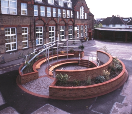 Formation of new masonry amphitheatre within existing playground. Project received commendation at the Brick Awards