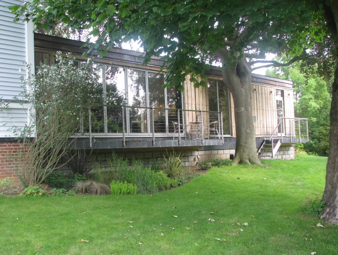 Bespoke single storey extension to provide a new kitchen, utility, dining area and garage. Cantilevered floor to carry external patio area, sips panels to form external walls with Oak cladding and copper roof. Carried out repairs to existing single glazed two-storey cube abutting Grade II Queen Anne House.