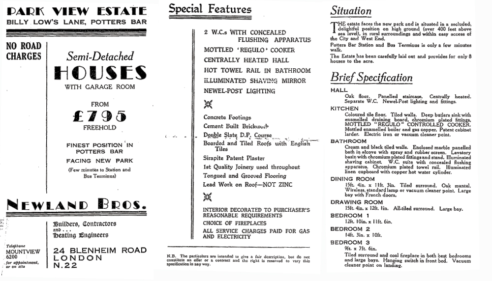 Having established themselves as Main Contractors they then diversified into property development. Many properties in Potters Bar and Brookmans Park were designed and built by Newland Brothers (see picture of Billy Lows Ad).